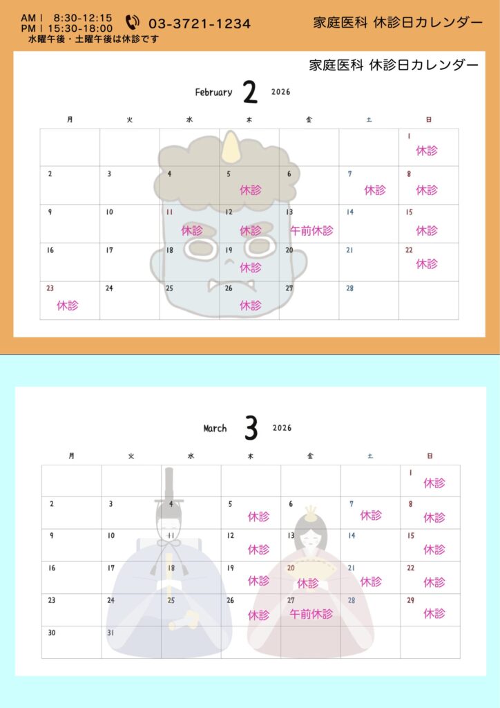 休診日カレンダー2026年2〜3月分を掲載いたします。ご確認ください。